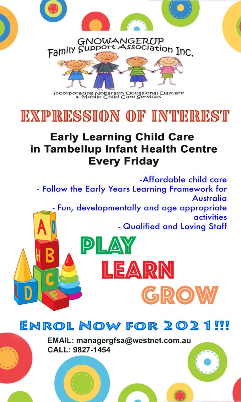 Gnowangerup Family Support Association Inc. is seeking Expressions of Interest in Early Learning Child Care in the Tambellup Infant Health Centre every Friday during the School Terms in 2021.
